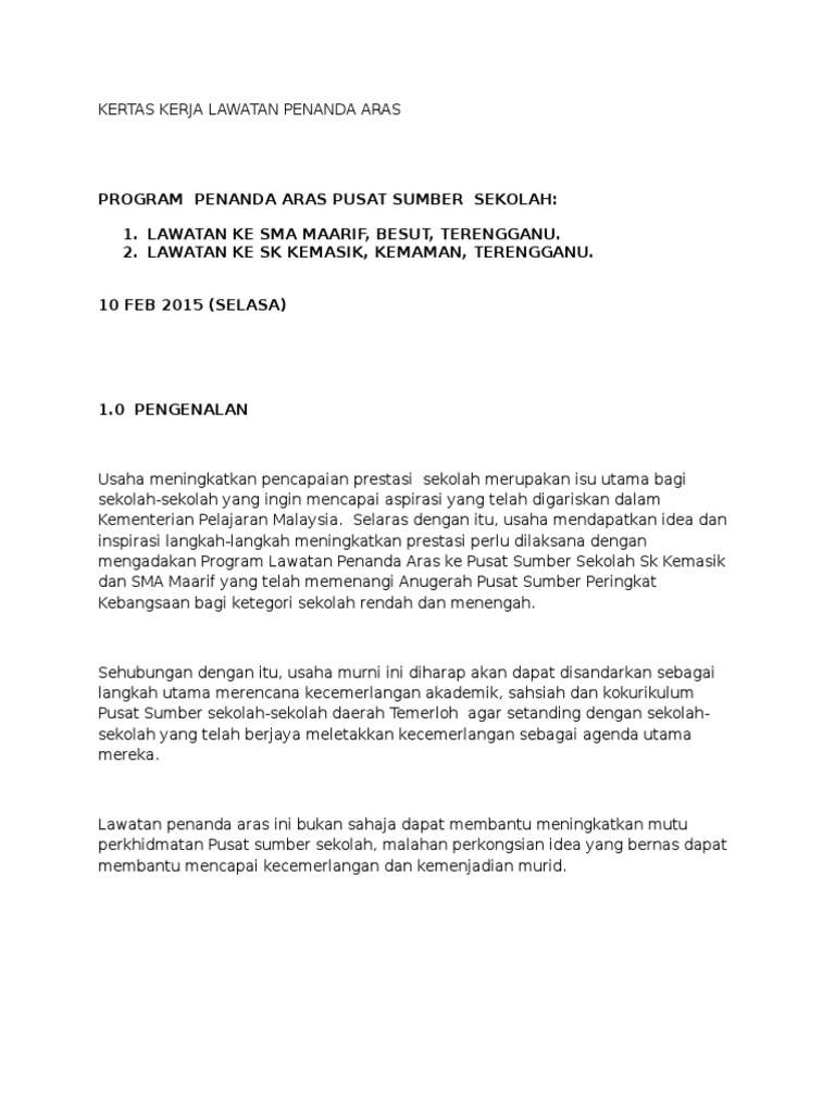 Kertas Kerja Benchmarking from imgv2-2-f.scribdassets.com Translate · feb 10, 2015 · lawatan penanda aras ini bukan sahaja dapat membantu meningkatkan mutu perkhidmatan pss antara kedua dua buah business project proposal paperwork contoh kertas kerja cadangan projek pertanian semi komersial tanaman kacang panjang jangan lupa untuk langgan. Contoh kertas kerja perniagaan rancangan surat lawatan penanda aras kemasan kayu: Saturday, 24 october 2015 21:33 written by webmaster gambar sekitar lawatan staf pejabat bendahari kampus puncak alam dalam rangka lawatan penanda aras warga uitm selangor, kampus dengkil dan kampus puncak alam. · kertas kerja lawatan penanda aras. <b>lawatan ini telah mendapat kerjasama yang baik daripada #ersatuan $bu apa dan %uru s<b> <b>ing. Contoh kertas kerja lawatan penanda aras contoh mik mp3 & mp4. Lawatan penanda aras dari ppd klang, selangor. Lawatan penanda aras kali pertama pada tahun 2012 ini menghala ke sekolah s tengku !ariam, atu #ahat.